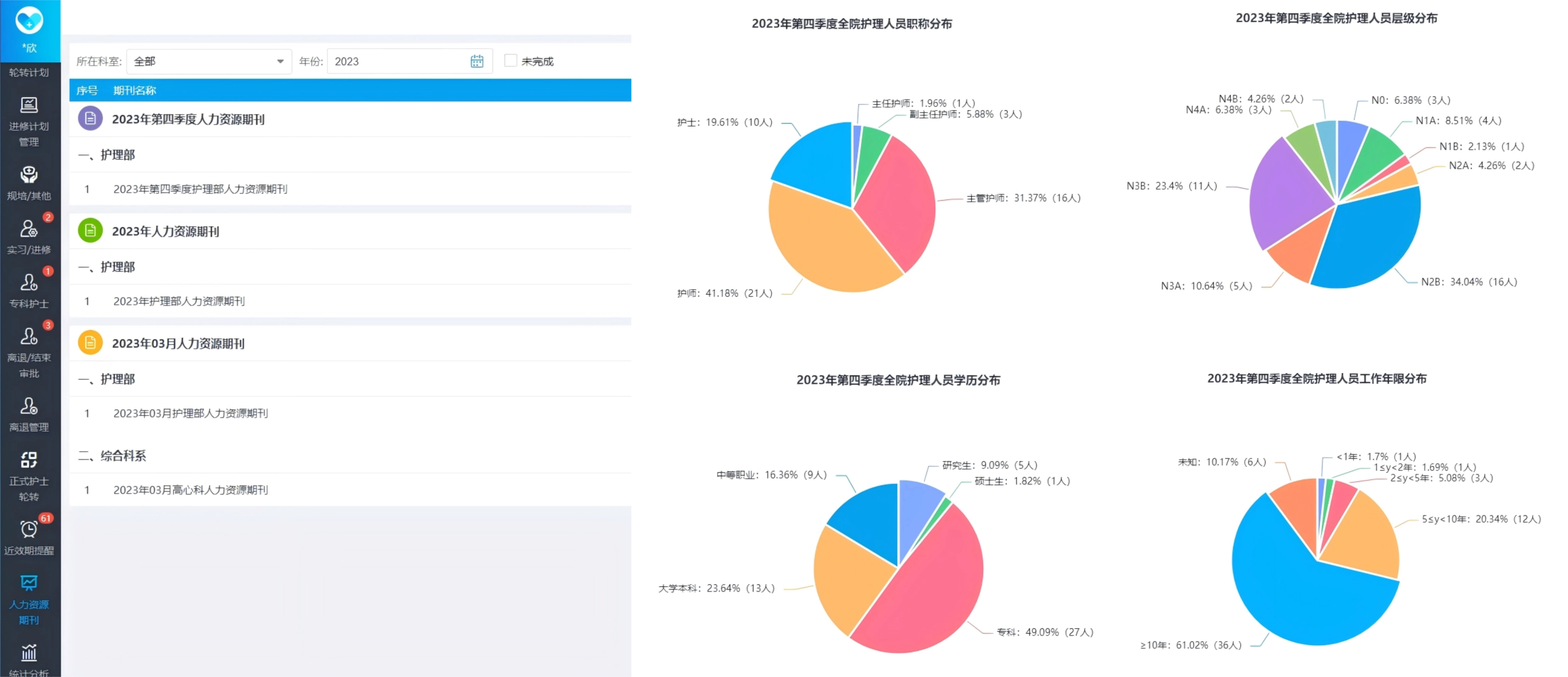 护理管理人员可轻松地按月、季、年自动生成《人力资源期刊》。期刊内容可涵盖人员动态、层级分布、梯队建设分析、近效期提醒等,让护理部能快速掌握全院护理队伍的整体状况,用于汇报、存档或制定下一步人才战略,极大提升了管理效率和专业化水平。
