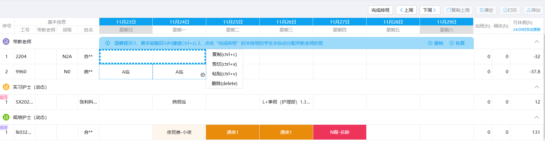 系统提供直观灵活排班界面,支持复制粘贴、拖选调整,操作简单流畅,排班结果实时呈现,大幅提升排班效率与体验,真正实现“所见即所得”的智能化排班管理。