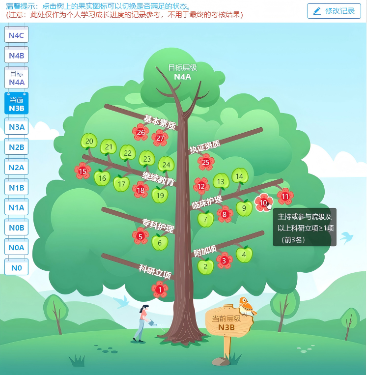 其中,我们将抽象的晋升考核条件转化为一棵栩栩如生的个人成长树。继续教育、业务学习、主持病区等护理人员的每一项努力都转化为果实,直观对应着其职业层级的提升,将晋升规则转化为温暖的情感激励和清晰的目标导向,极大增强护士的参与感与成就感,助力层级晋升目标的高效达成。