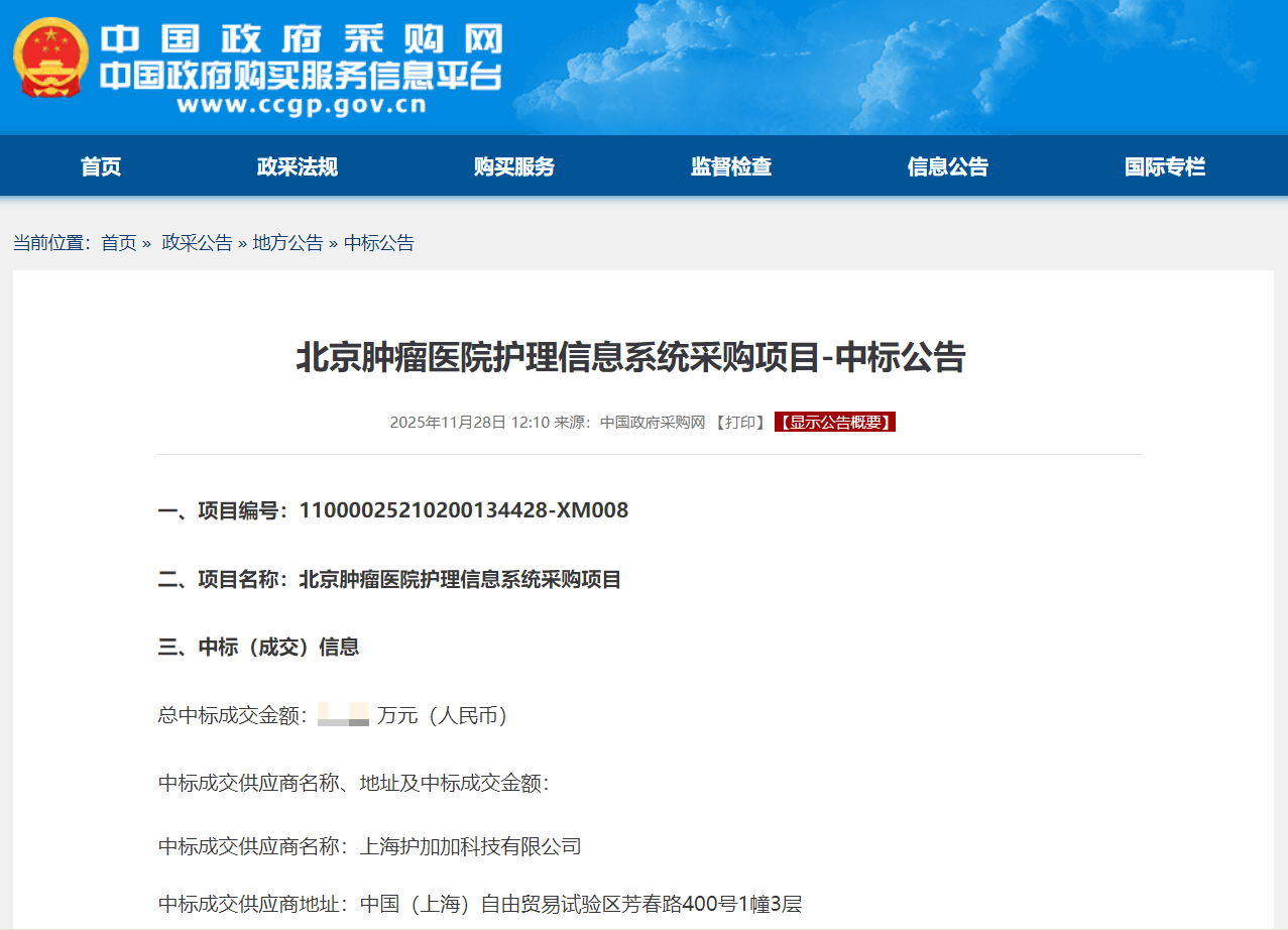 此次中标是护加加在顶级肿瘤专科医院信息化建设领域的又一重要里程碑。新征程,携手行!我们将全力以赴,为中国肿瘤专科护理的高质量发展贡献坚实力量!