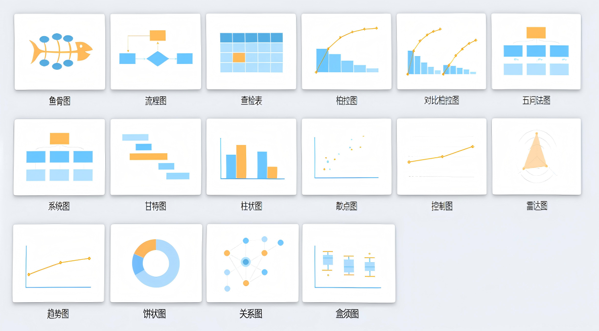 内置20+图表类型(如鱼骨图、柏拉图、雷达图等),支持数据联动分析、图表自动生成。